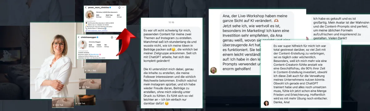 Seit Oktober 2023 nutze ich ChatGPT intensiv in meinem Business. Ich habe mich im Prompt Engineering zertifizieren lassen und ein System entwickelt, mit dem ich Content in der Hälfte der Zeit erstelle – und dabei bessere Ergebnisse, mehr Reichweite und mehr Kunden gewinne.